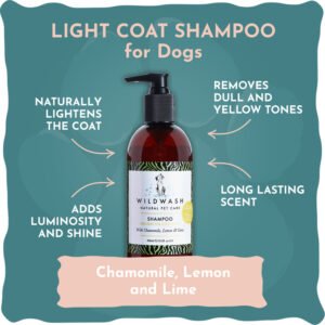 Белите кучета са прелестни… докато не се появят онези досадни жълти нюанси и сивкав оттенък. Забравете за агресивните избелители! WildWash Light Coat Shampoo използва магията на природата – лайка, лимон и лайм, за да изсветли козината нежно и безопасно.