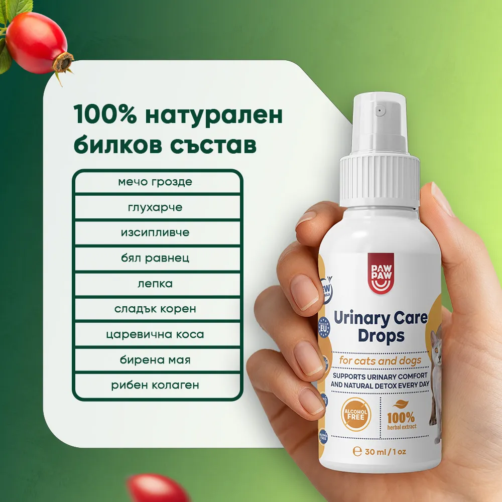 Тихият дискомфорт, който не могат да изразят. Променливо настроение, странно държане, избягване на тоалетната… Понякога тези сигнали са знак, че нещо вътре не е наред. Urinary Care е втората стъпка от грижата – билкова подкрепа за пикочните пътища и бъбреците, която действа нежно, но сигурно.Без лекарства. Без хапчета. Само няколко впръсквания в храната – с вкус, който не отблъсква. Грижа, която се приема с лекота – и тялото им го оценява.